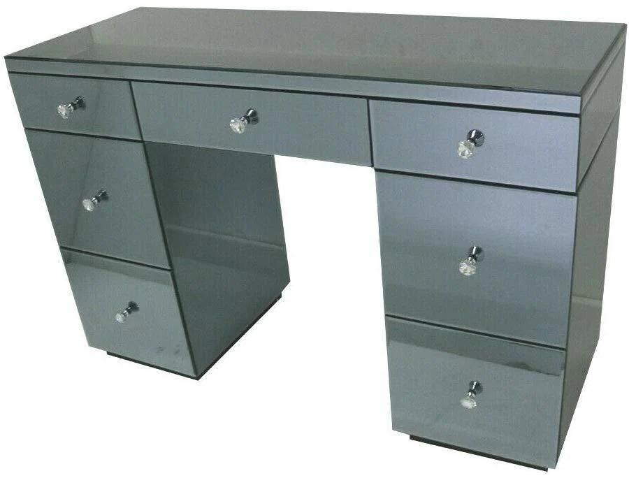 * Smoked Grey Modern and luxurious, add instant glamour to your bedroom with this stunning Mirrored Dressing Table. Made from high shine mirrored glass , this deluxe dressing table is everything you need to pamper yourself in style.